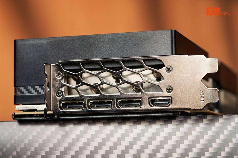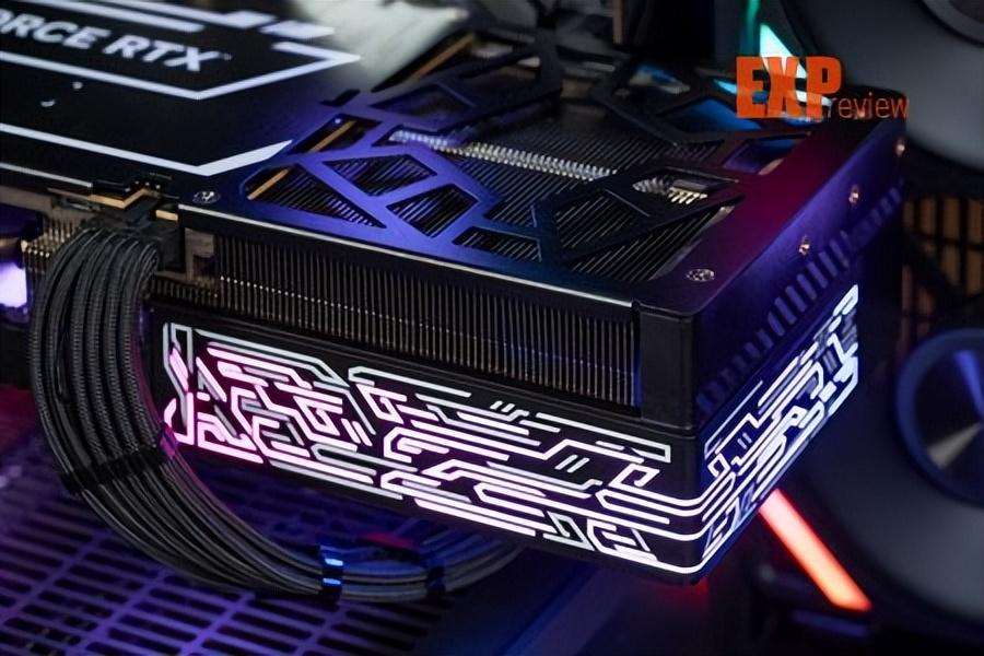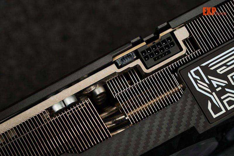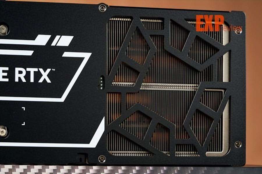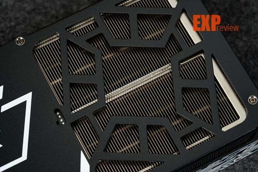 显卡配有全金属加固背板,同时它也有辅助散热的作用,背板上有大面积的开孔,第三把风扇的风穿透鳍片后可以直接通过,没有pcb的阻挡大幅降低了风阻,这种贯穿设计可提供更好的显卡散热效果。