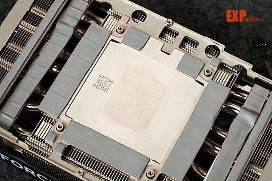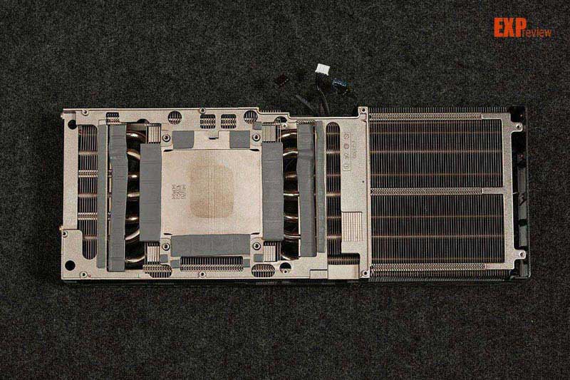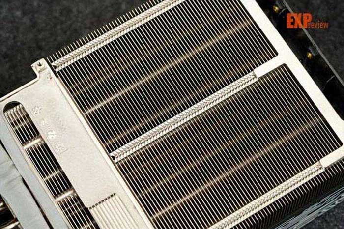 游星x散热器底部采用大面积均热板与gpu接触,可以非常高效地把gpu热量传递给热管,为了给这块tgp高达575w的显卡散热,这个散热器一共用了多达7根8mm直径热管,采用回流焊与鳍片相连,并且采用了较高密度的鳍片布局,鳍片间距大概1.4mm,所有的热管和鳍片都有做表面镀镍处理。