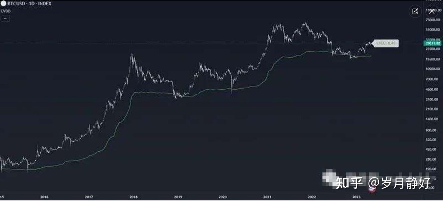 当比特币价格触及绿线时,代表比特币价格被严重低估,是一个很好的买入机会。