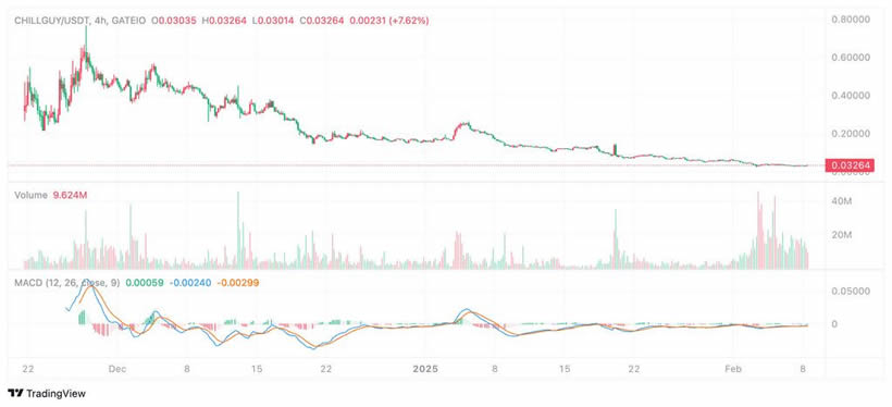 从2024年12月中旬开始,chillguy token进入了持续的下降趋势。价格从约0.10美元下跌至0.0245美元的低点,损失超过95%的峰值。