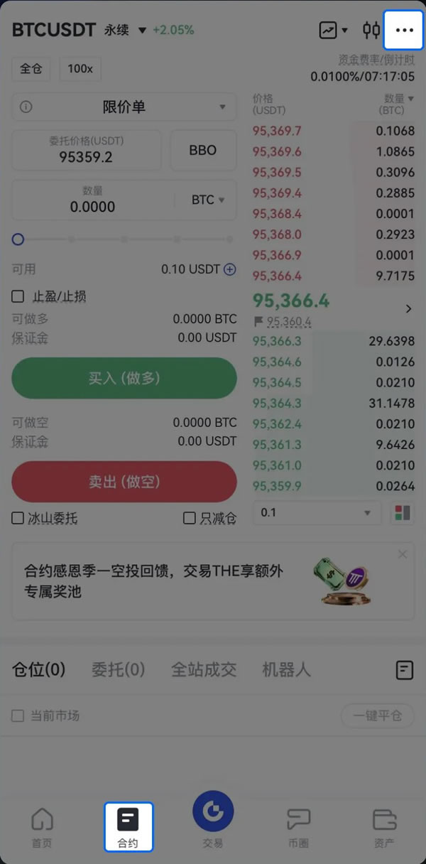 1、点击导航栏中的「合约」,点击右上角三个点的「设置」按钮