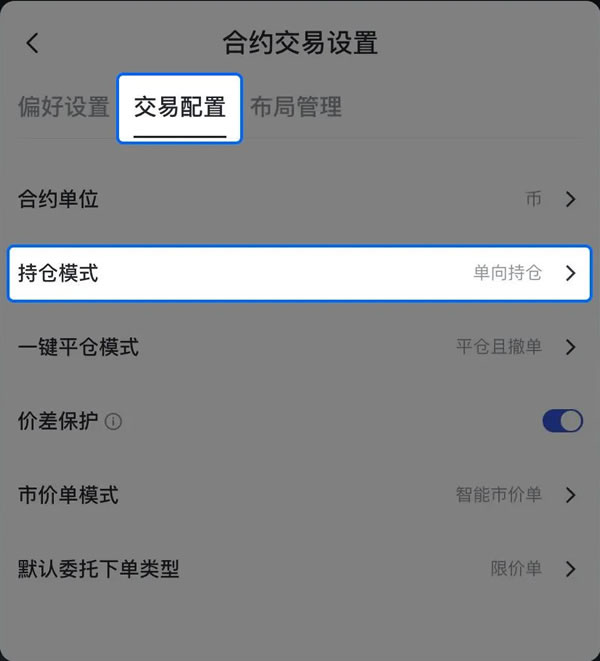 3、点击「交易配置」 点击「持仓模式」