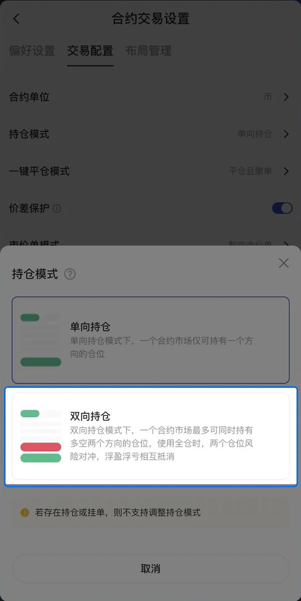 注意:切换持仓模式前,应先检查持仓和挂单状态,确认当前没有未平仓的合约和挂单。如果有,需要先平仓或取消挂单。