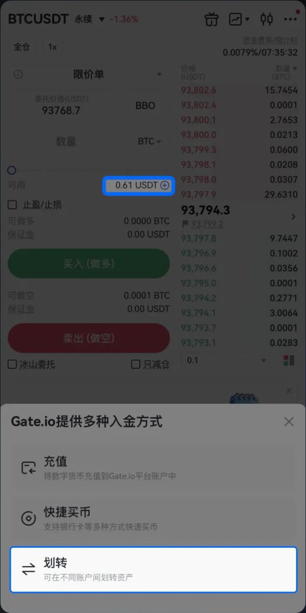 在合约交易页面,点击「可用」处的「+」按钮,选择「资金划转」,将资产从其他账户划转至合约账户。