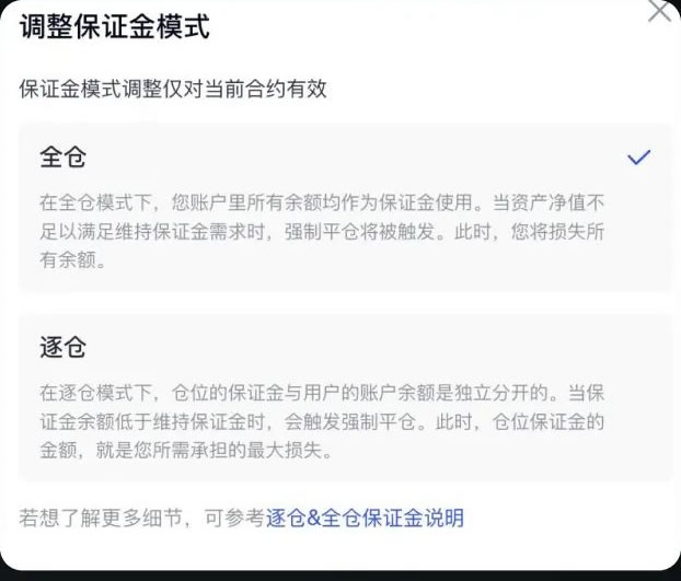 1、在合约交易页面,点击「杠杆」选项,选择全仓或逐仓的保证金模式。