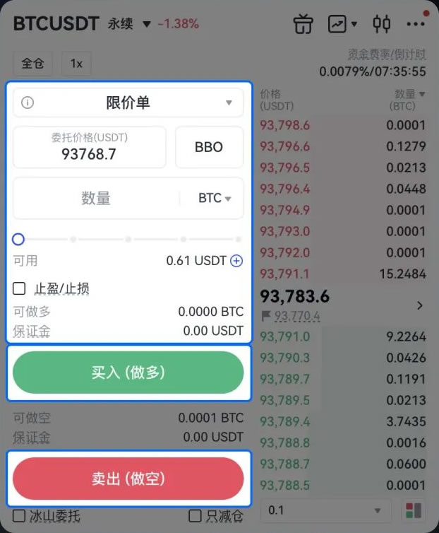 3、输入价格、数量,确认下单方向,点击「买入做多」或「卖出做空」完成下单。