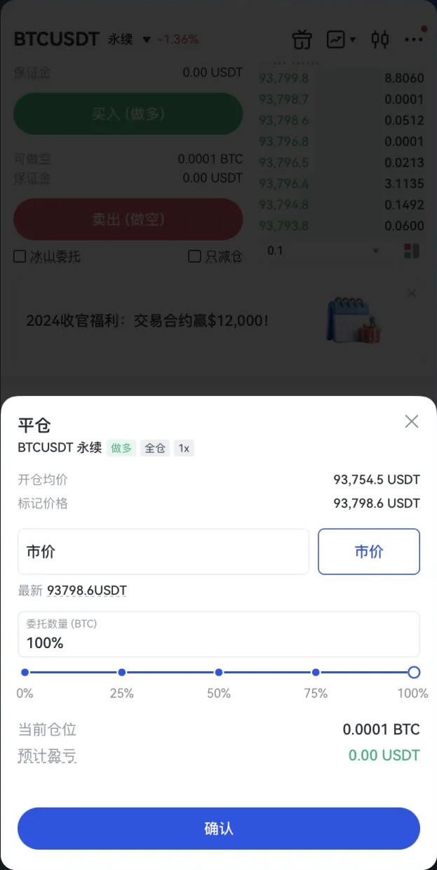 2、当达到预期收益时,点击「平仓」,选择市价、限价或一键平仓完成操作。