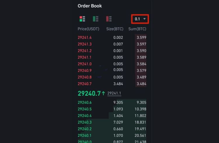 7、查看实时订单簿数据。在该区域右上角的下拉菜单中可以调整订单簿的精确度(默认为0.01)。在平台上实时查看最新成交信息。