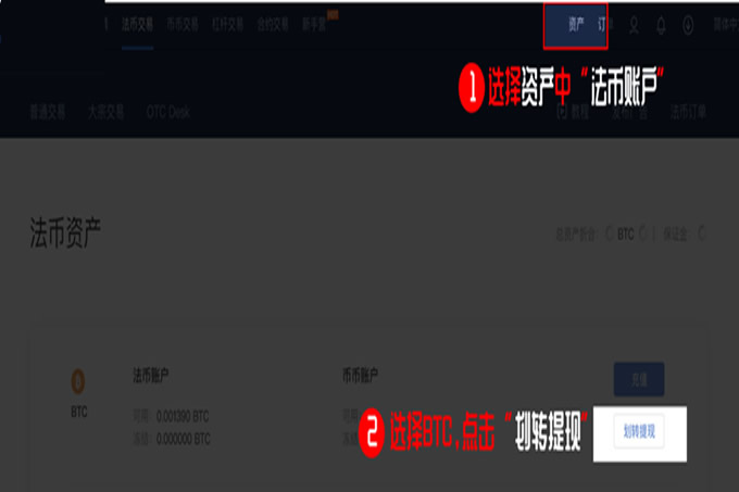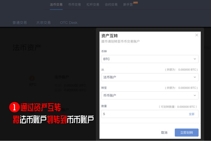 5、收到币后可以将币从「法币账户」转到「币币账户」中。这样才可以进行【币币交易】(币与币之间买卖)。