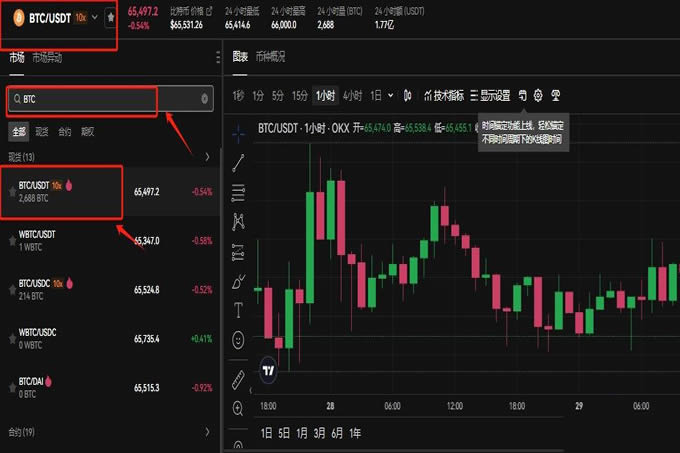 8、在搜索框输入btc,选择btc/usdt交易对,可以看到btc实时行情