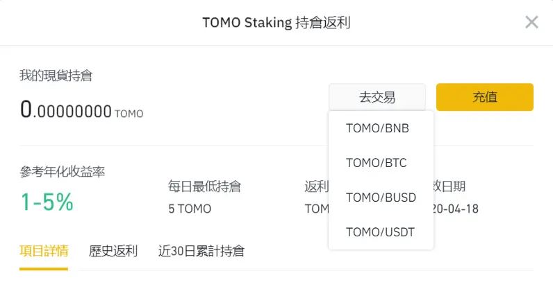 - 如果你没有tomo 币,可以透过右上角的「去交易」或「充值」功能,存入tomo 币