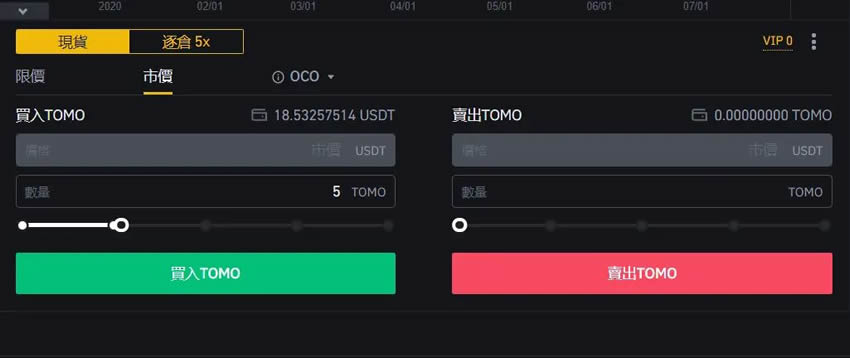 - 在「数量」那一栏,输入你想购买的数量,并按下买入tomo(这边我们选择市价买入),便可完成交易!