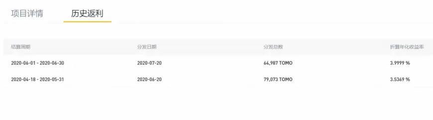 以tomo 为例,这次利息发放是7/20 ,总共发出了64987 个tomo 作为利息给所有投资人,换算下来约4% 年化报酬率。