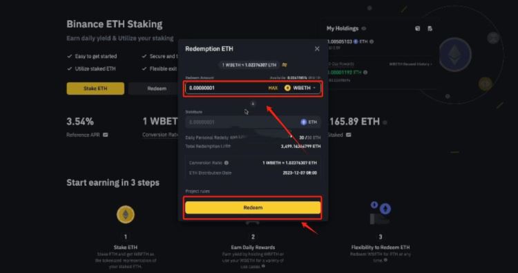 3、输入赎回数量,并通过门户网站提交赎回请求,用户一步即可将wbeth赎回为eth。