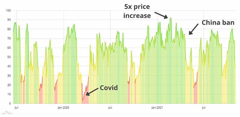 比特币恐惧与贪婪指数通常位于贪婪区间,很少会持续一个多月陷入极度恐惧。它也向我们表明,比特币情绪与过去两年加密领域的重大·事·件有关。