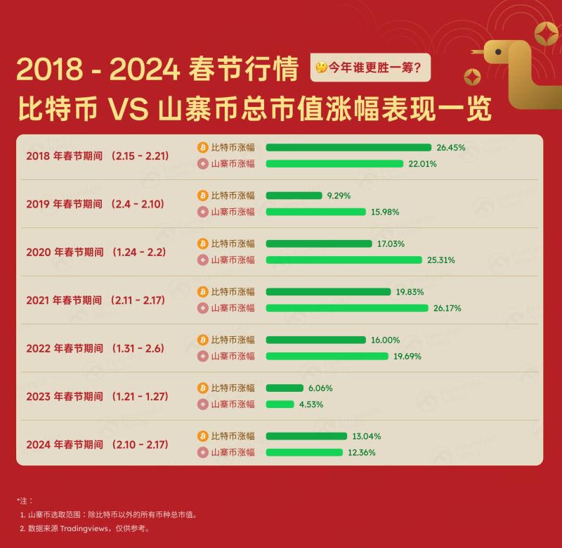 不过若从农历春节短期行情而言, 2018-2024 年的统计图表显示,比特币与山寨币往往能有不错表现。