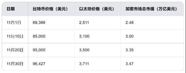 第一段是自11月5日特朗普赢得美国大选以来,比特币价格便开启了迅猛上涨的态势。11月10日,比特币价格突破8万美元大关,仅隔三天,又在11月13日冲破9万美元,市场表现极为强劲。