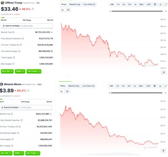 由此可见,特朗普家族已经全员参与加密行业,双方的绑定也在不断地加深。但是名人效应在币圈的买单也是一阵一阵的,市场的反应也不可能100%在寡头的预计中。例如在trump代币的发行引发了市场的狂热追捧,大量资金涌入加密市场时,随着melania的推出,竟然引发了吸血效应,trump代币价格一度暴跌60%,显示出市场对特朗普家族动态的高度敏感。