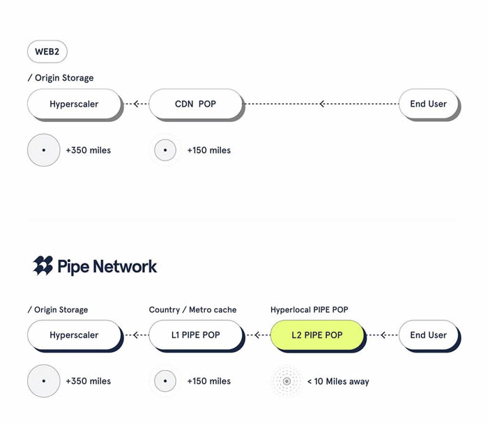 pipe 网络是一个去中心化内容分发网络(cdn),构建于 solana 区块链上。该安全、可扩展且高度本地化的方法允许无许可的贡献者在特定区域建立接入点(pops),确保快速访问高质量的资料和实时应用。pipe 网络设想成为去中心化互联网的基础,提供快速、可靠且透明的数字内容访问,以实现持续的 3 毫秒传输时间。