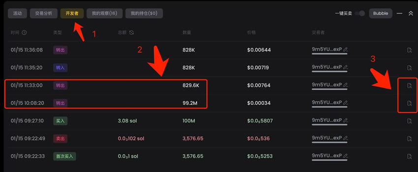 debot的团队 @diting188 之前做的是 diting这个监控工具,做了几年。现在进行品牌升级 @ditingdata ,开始丰富产品功能,在监控的基础加上了交易、数据分析等功能。网址是 https://debot.ai?invitecode=175623 。为什么没有选择gmgn、xxyy或者bullx,因为这几个网站都并不会列出转账操作,用这几个网站的话还得再去solscan上根据dev的地址去找出具体的转账交易。