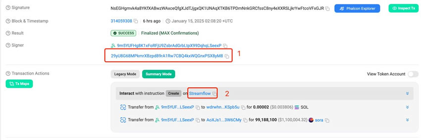 我们打开99.2m那笔转账(https://solscan.io/tx/nseghgmvk4a8ykfxabwzwaxceqfgxjdtjjgxqk1unaqxtkb6tpdmnnkgrcfssc8ny4exxrsljkrywftcovfxgjr),详情如下图,在图中2的地方我们可以看到有“streamflow”这个标记,这里是指的地址。streamflow是solana上常用的一个锁仓网站。看到此标记我们就可以知道这笔交易是用来锁仓的,但是锁仓的详情在这里我们看不到,因为我们需要到streamflow的网站上查看。