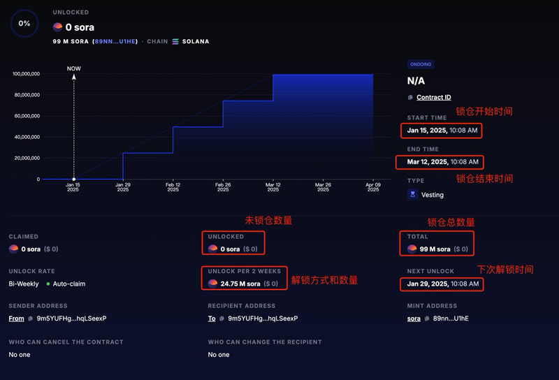 在上图中上面部分的右边可以看到锁仓开始时间是1.15 10:08,解锁时间是3.12 10:08。上图中下面部分是锁仓的详情,可以看到未锁仓数量是0,说明全部锁仓了,锁仓的总数量是99m,锁仓方式和数量那里说明平均每2周会解锁24.75m的代币,下次解锁时间是1.29 10:08,正好是2周后。