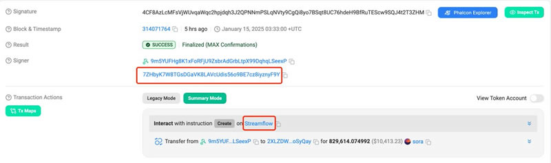 dev还有一笔829.6k的转出交易,官方推特并没有公布,我们也打开此转账记录进行分析(https://solscan.io/tx/4cf8azlcmfsvjwuvqawqc2hpjdqh3j2qpnnmpslqnvty9cgqi8yo7bsqt8uc76hdeh9bfrutescw9sqj4t2t3zhm),详情如下