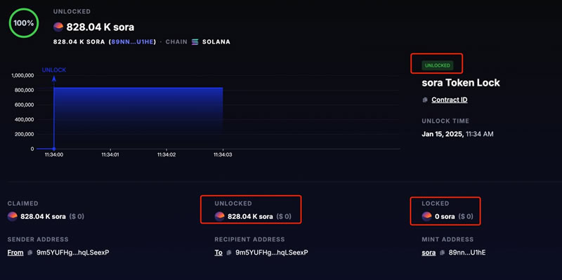 我们可以看到上图中绿色文字的标记“unlocked”,下面的未锁仓代币数量是828.04k,已锁仓数量为0,说明dev只是单纯的把币转到了streamflow的合约中,但是并没有做锁仓这个事。如果我们不进行仔细的分析,我们并不知道。