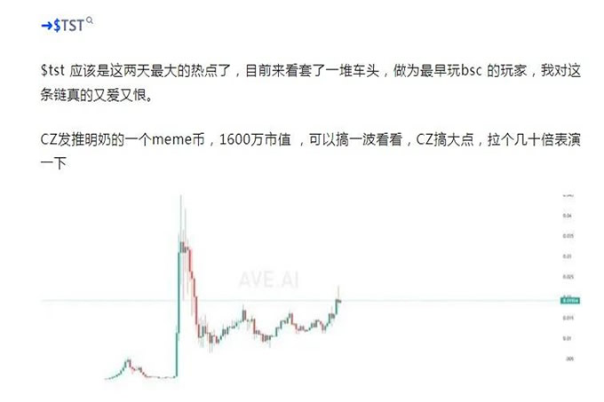 而且cz这几天频繁提及 meme,币安链的tst一天上线bn x货,有赚钱的机会;