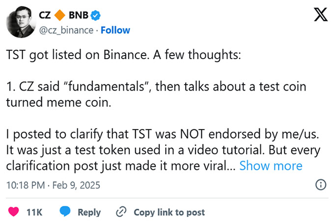 cz 的言论恰逢 tst 代币争议的爆发,binance 教程视频中的一个测试性 meme 币意外暴涨——市值一度达到 5 亿美元,之后又迅速崩盘。