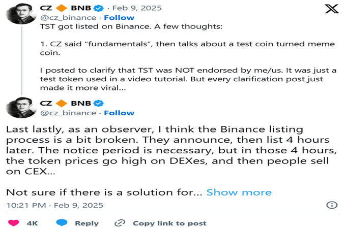 在 tst 争议中,cz 批评了 binance 的上币流程,指出该流程的公告至上币的四小时窗口期,使得交易员能够在 cex 交易开始前操控价格。