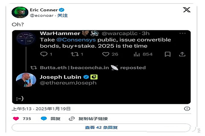虽然 consensys 尚未正式宣布 ipo,但 lubin 在 2025 年 1 月的一条推文中回应了笑脸表情符号(见下文),该推文恳求 consensys 上市并采用以太坊储备积累策略,这可能表明 ipo 即将到来。