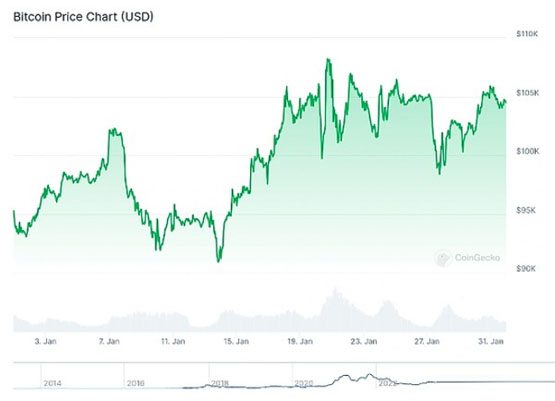 就职典礼当天,比特币价格跃升至 108,786 美元的历史新高,而年初时的价格为 93,508 美元,本月剩余时间基本保持在 10 万美元以上。