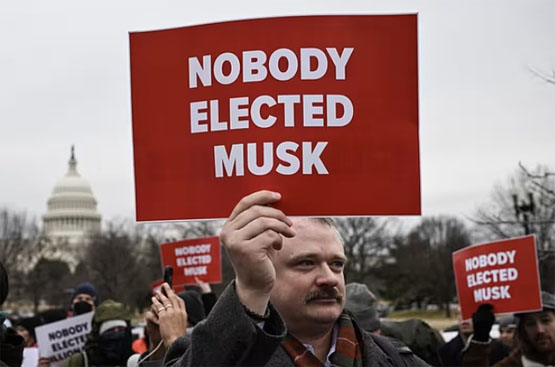 2月5日华 盛顿特区,抗议者在美国劳工部外举着反对马斯克的标语。
