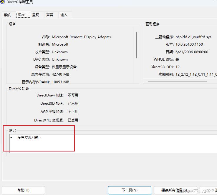 4)运行dxdiag,查看 显示 标签页,如果显示 没有发现问题。表示成功。