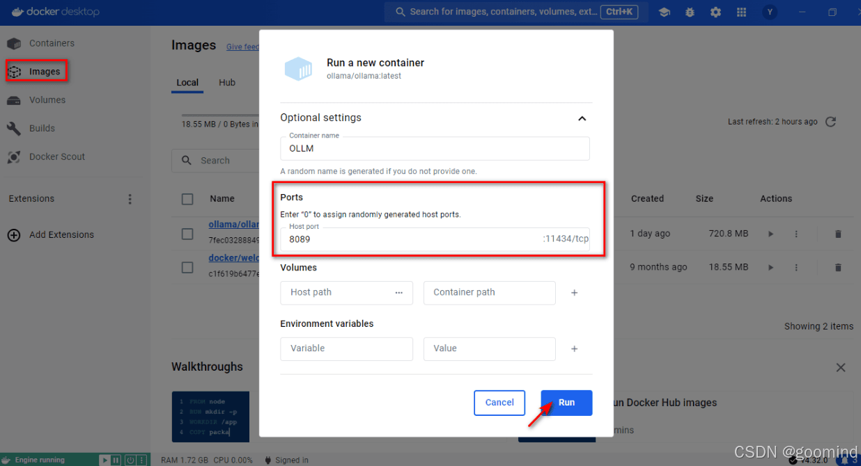 images中找到ollama镜像,点击run标识即可运行,注意运行前在弹出的可选设置里面,选定一个端口号(如8089)。