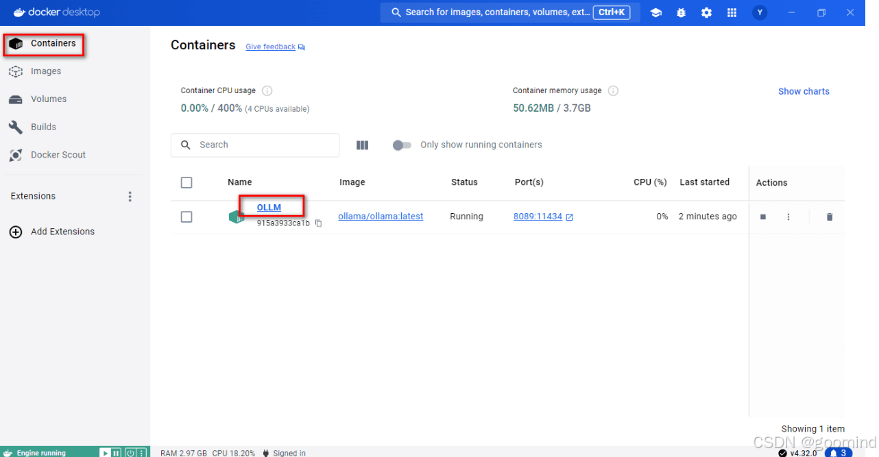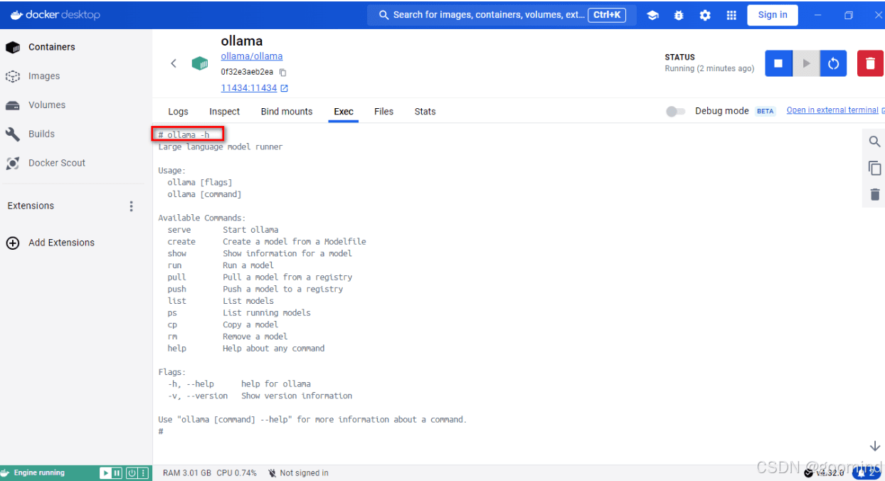 containers中找到该镜像,点击ollm即可进入 ollama 界面