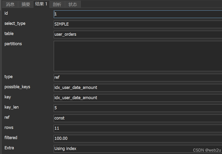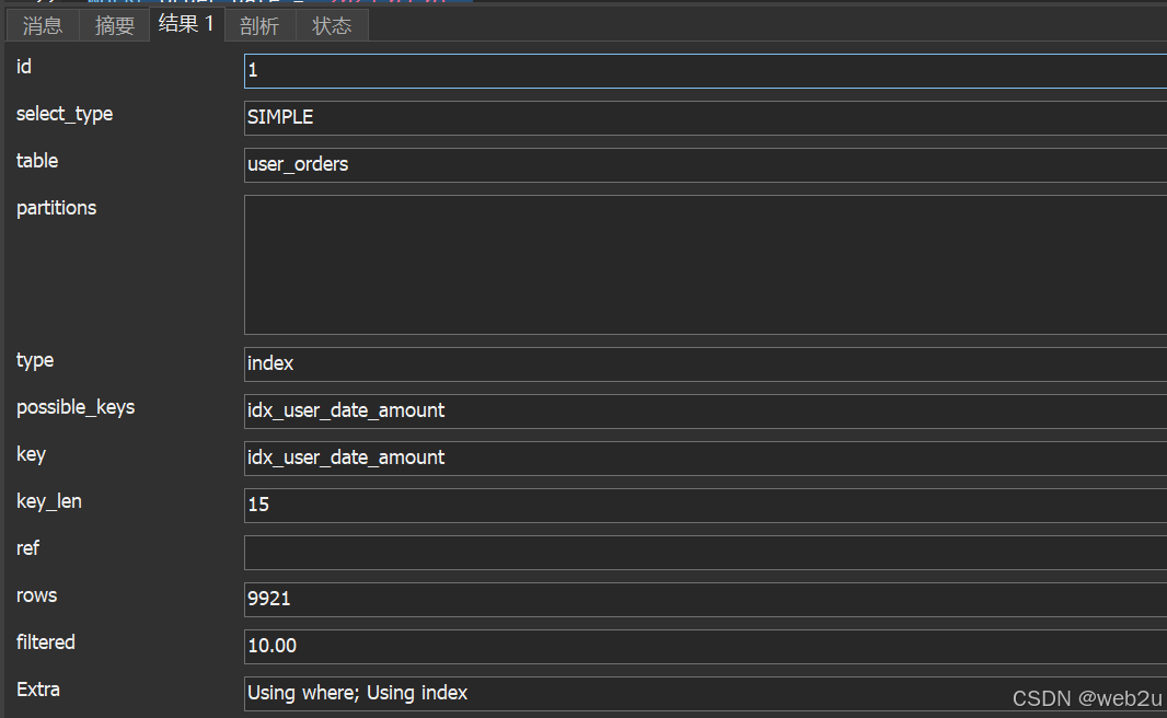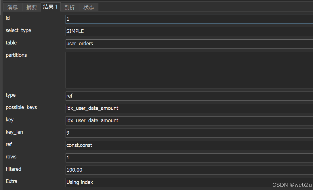 -- 完全满足最左匹配原则(使用全部索引列) explain select * from user_orders where user_id = 100 and order_date = '2023-05-01' and order_amount = 500;