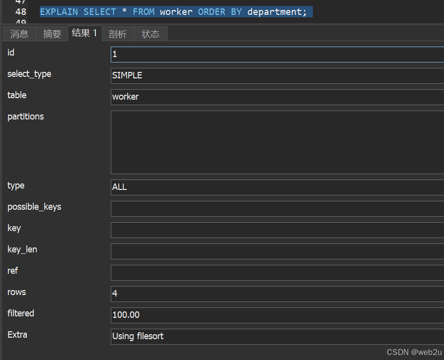 -- 对无索引的department字段排序 explain select * from employees order by department; -- 结果显示: using filesort
