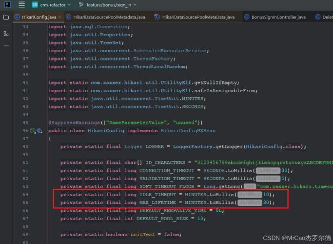 怀疑问题与连接池有关,特别是考虑到线上负载较高的高峰时段。经过检查,项目使用的是hikaricp连接池,相关配置如下: