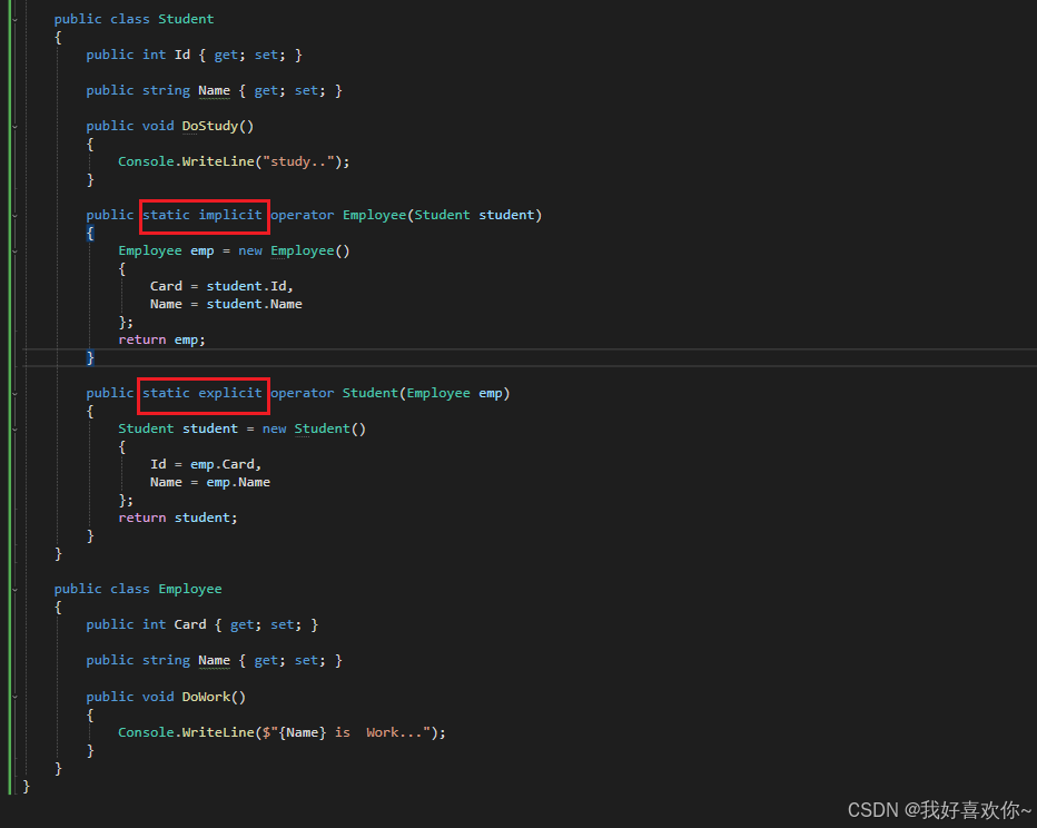用static implicit 修饰 是代表隐式转换 返回的是employee 实例就是 转换成employee类型。