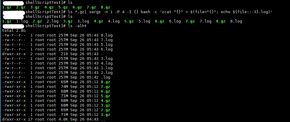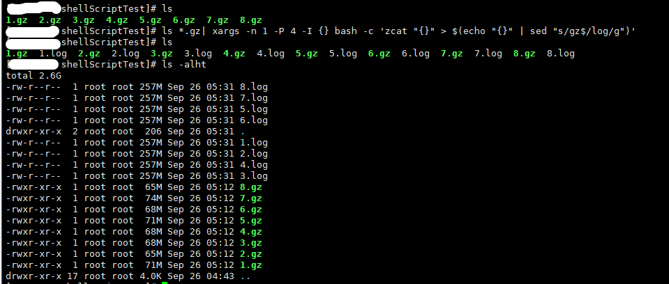 ls *.gz| xargs -n 1 -p 4 -i {} bash -c 'zcat "{}" > $(echo "{}" | sed "s/gz$/log/g")'执行结果如下图所示:
