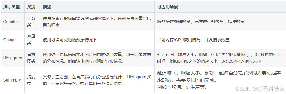 prometheus四种类型的指标counter 计数,gauge 观测类,histogram 直方,summary 摘要 用golang语言如何构造这4种类型对应的指标,二是搞清楚修改指标值的场景和方式。