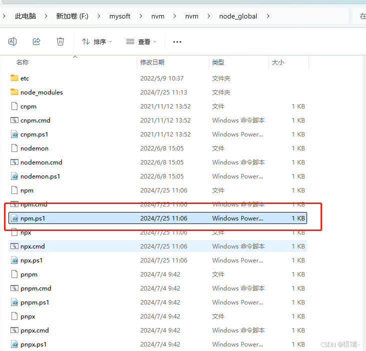 可是在f:\mysoft\nvm\nvm\node_global\npm.ps1这个目录下看到是有这个文件的
