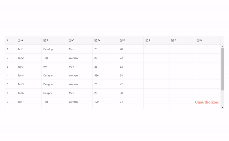 { id: 10001, a: 'test1', b: 'develop', c: 'man', d: '23', e: '28', f: '', g: '', h: '' },