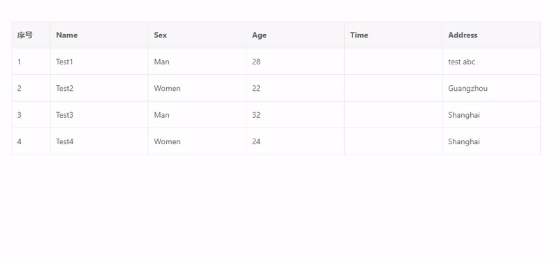{ id: 10004, name: 'test4', role: 'designer', sex: 'women', age: 24, address: 'shanghai' }