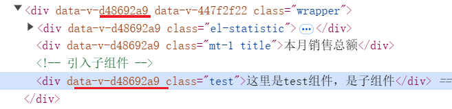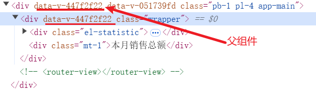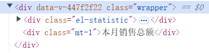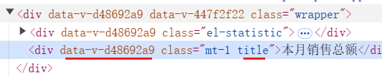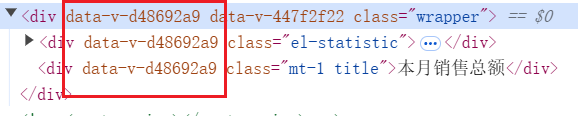 就是把a组件自带的哈希值data-v-d48692a9,加到了选择器上,使用了类选择器加上属性选择器,选中了wrapper容器。如果选择内部的元素,比如 文本 本月销售总额,scss代码如下: