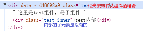 能选中的原因是因为,test组件的根元素上存在着父组件a的data-v-d48692a9哈希值: