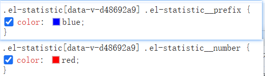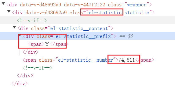 可以看到¥符号和数字74811并不是statistic元素的直接文本,有其它盒子包裹了这个文本。当前的样式选中的元素是class=el-statistic statistic的div。实际上我们需要选中的是这个子组件内部的元素:el-statistic__prefix内部的span元素,所有首先我们需要选中el-statistic__prefix元素,这个逻辑正好就是在父组件中选中子组件内部的元素,所以这里使用:deep()可以生效。