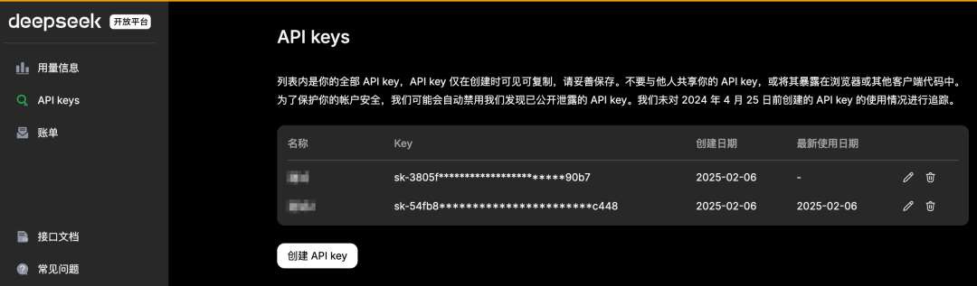 首先我们去deepseek的开发平台获取秘钥,如果没有注册过的账号的先注册,点击创建api key后给它命名,即可成功获取,api key只有首次创建能复制,忘记了则需要销毁重建。